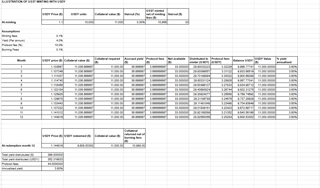 - Calculations and Fees: The protocol does not issue USST at a 1:1 ratio immediately. It applies a "haircut" and minting fees to ensure system solvency. For instance, in a detailed illustration, a deposit of 10,000 USDY units (valued at $11,000) might undergo a 0.30% haircut ($33) and a 0.1% minting fee.